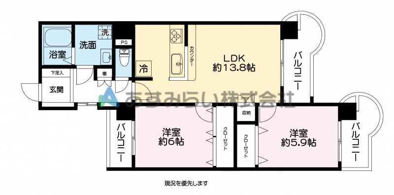 間取り 2LDK (洋室6/洋室5.9/LDK13.8)